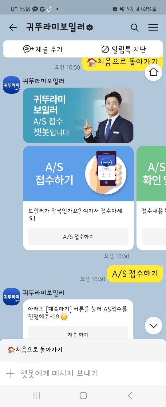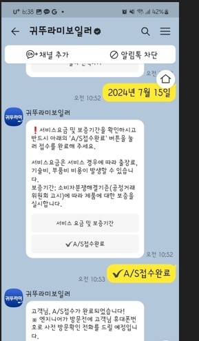 -> 카톡으로 문자 전송오면 AS 신청 누르기