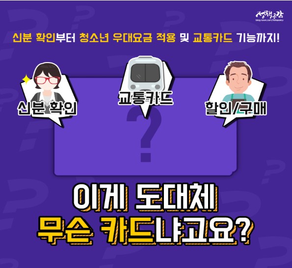 청소년증은 학교안, 밖 모든 청소년들의 신분확인과 할인, 우대 제공 등을 위해 만들어진 증명 카드입니다.