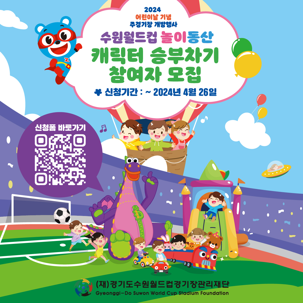 2024년 어린이날 기념 주경기장 개방행사「수원월드컵 놀이동산」이 5월 5일 일요일 수원월드컵경기장 주경기장 일대에서 진행됩니다. 운동좋아하는 가족은 너무 신날 것 같습니다.